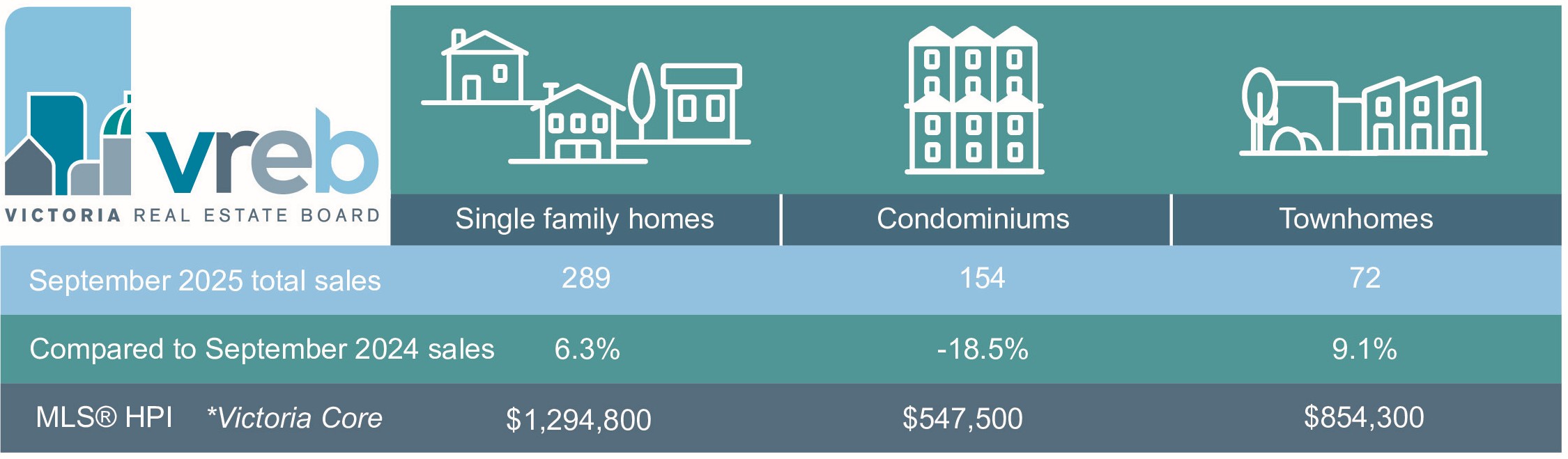 October 1, 2025 A total of 554 properties sold in the Victoria Real Estate Board region this September, 3 per cent fewer than the 571 properties sold in September 2024 and 5.5 per cent more than in August 2025. Sales of condominiums decreased by 18.5 per cent from September 2024 with 154 units sold. Sales of single family homes increased by 6.3 per cent from September 2024 with 289 sold.