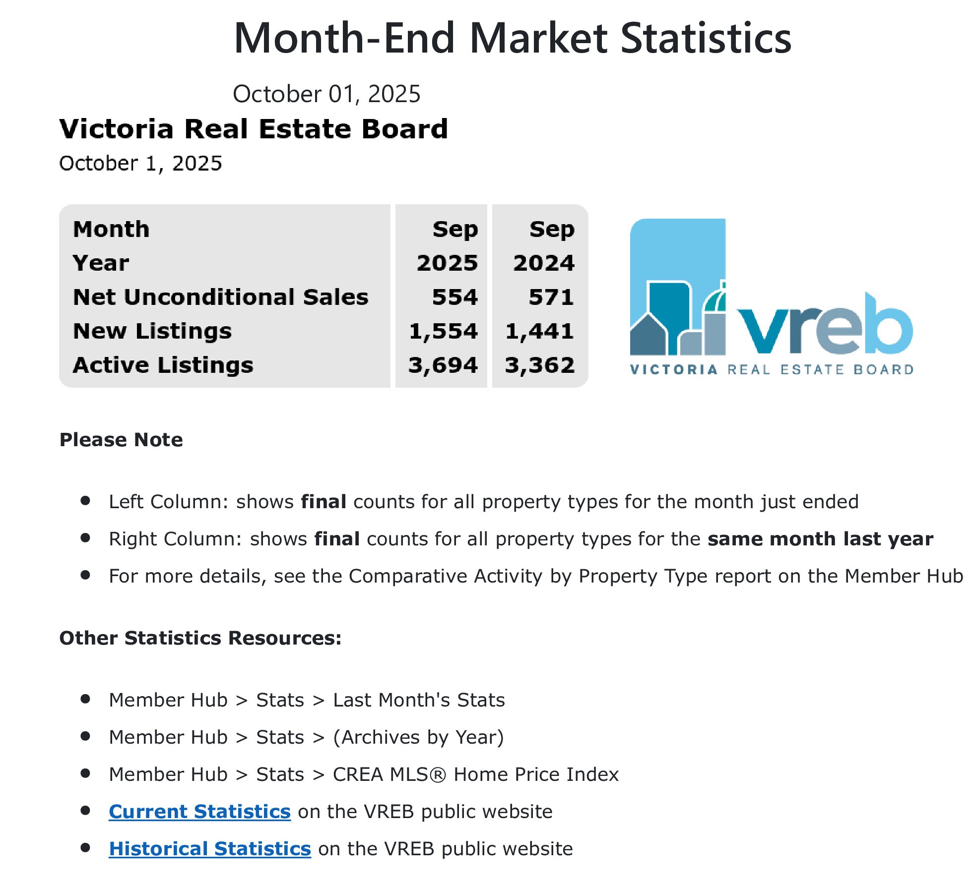 There were 3,694 active listings for sale on the Victoria Real Estate Board Multiple Listing Service® at the end of September 2025, an increase of 2.6 per cent compared to the previous month of August and a 9.9 per cent increase from the 3,361 active listings for sale at the end of September 2024.
