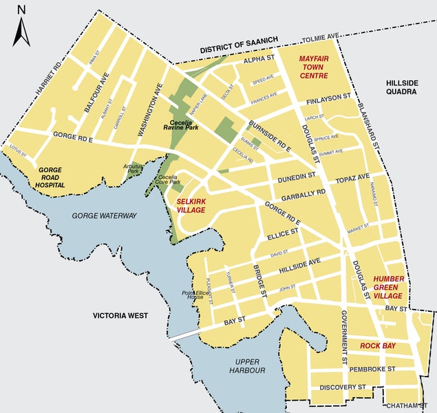 This expansive neighbourhood, stretching from the northern edge of downtown through Rock Bay to the city’s north and west limits along Harriet and Tolmie Streets and east to Blanshard Street, was for centuries home to First Nations whose campsites dotted the harbour shore. Known locally as Burnside-Gorge, this neighbourhood is a mixture of residential, light industry, motels and commercial operations, alongside the Selkirk Waterway.