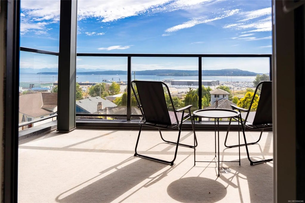 Welcome to Lumina in Harborview District, another principal property community in the heart of downtown Nanaimo, where city living meets coastal charm. Steps from the harbourfront, seawall, cafés, shops, parks, and Hullo Ferries, Lumina places you in the center of a growing, evolving district. Enjoy your mornings on the rooftop patio surrounded by lush greenspace and expansive ocean views. This beautifully designed 2-bedroom, 1-bath home features bright, open living with views of the harbour, city, and mountains — a striking blend of coastal beauty and urban energy. The kitchen stands out with waterfall-edge countertops, sleek cabinetry, and contemporary lighting, all contributing to a clean, modern aesthetic. Whether it’s a stroll along the waterfront, coffee with friends, or a rooftop sunset, this home connects you to the best of downtown — and the exciting future unfolding around it.
