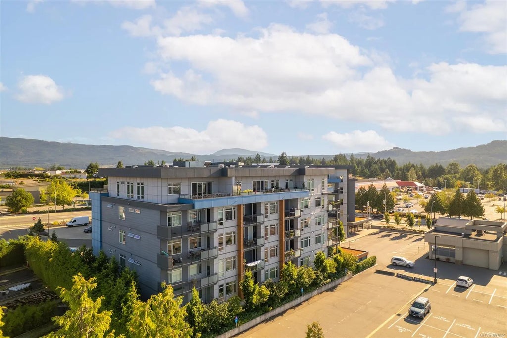 Welcome to The Met, North Nanaimo's most desirable area, featuring walkable access to all levels of shopping, restaurants, grocery and transit, not to mention dedicated bike lane access throughout Metral drive. This 2 bed 1 bath corner unit offers open concept living, 9 foot ceilings with plenty of natural light, views of the mountains and sunset skies. This newer 847 sq ft corner unit offers high quality vinyl wide plank flooring, stainless steel appliances in the kitchen, a large laundry room with a window and a bonus storage/office den area. The deck space is enormous and gives options for extra seating and evening sunsets. The Primary bedroom offers ample closet space and plenty of natural light.All measurements are approximate and may be verified if important. Pets allowed with some restrictions. 1 underground secured parking spot.