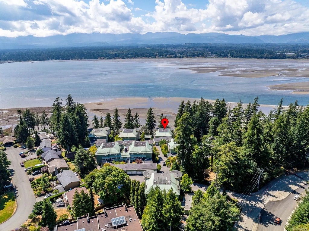 Welcome to coastal living at Emerald Shores. This 1,569 sq.ft. waterfront condo offers effortless one-level living with no-stair access from your private garage. From the moment you enter, panoramic south-facing views of Comox Bay and the Beaufort Mountains take center stage, flooding the home with natural light. The open-concept design is perfect for relaxing and entertaining, featuring a granite-appointed kitchen with stainless steel appliances and a spacious living room with a cozy natural gas fireplace. Step out to your private balcony and soak up the ocean breeze as the tides roll in. The primary suite is a retreat with its own balcony access, walkthrough closet, and spa-like ensuite with double sinks, a tiled walk-in shower, and a soaker tub. With 2 bedrooms, 2 bathrooms, plus a versatile den, you’ll have room for guests or a dedicated workspace. This pet-friendly community welcomes one medium-sized dog or cat. 3D tour & video in media links.