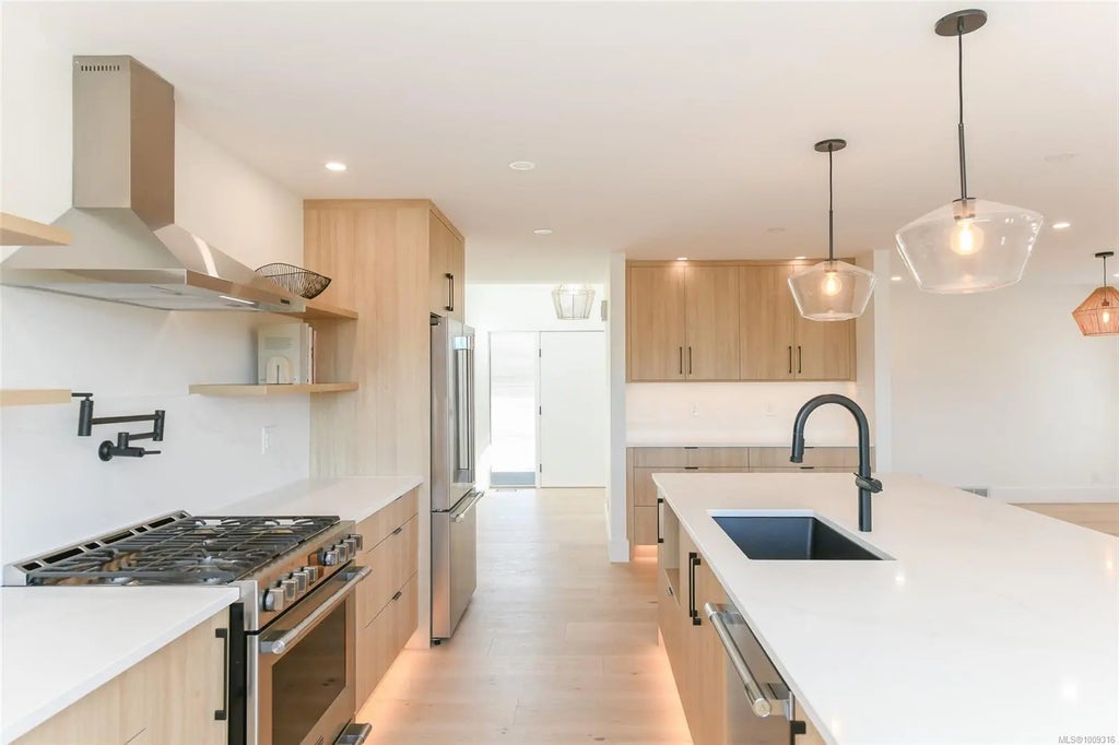 A rare blend of beauty, function, and flexibility. This 5 bed, 3 bath walk-out rancher offers 4,000+ sq ft with ocean & mountain views, a private yard, and a coveted location in a top school catchment. Fully renovated in July 2025 and never lived in, the upper level features 3 bedrooms, 2 bathrooms, a new kitchen, brand new high-end hardwood floors, custom stair railings, new lighting, fresh paint, and a 54x14 ft deck off the kitchen and primary suite. The lower level echoes the same care with 2 bedrooms, 1 bathroom, large second laundry, side entry, covered patio, plumbing for a kitchen or bar, and an updated gas fireplace. Extras include a generous mudroom, new front door, 2-car garage, mature landscaping, Poly-B removal, on-demand hot water (2024), and roof (~8 yrs). Designed in a Scandinavian-inspired, organic modern palette—soft, airy, serene.