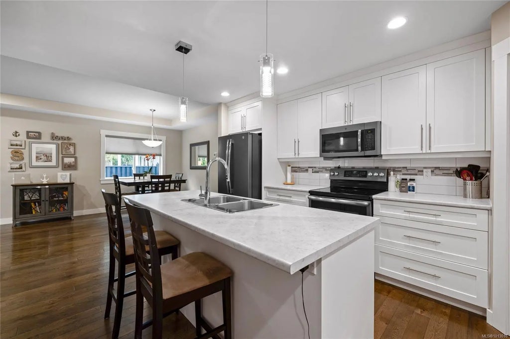 Built in 2017, this beautiful 5-bed, 3-bath home offers over 2,300 sqft of modern living space. The kitchen features sleek black stainless-steel appliances, a walk-in pantry, and opens to a bright living/dining area with a cozy natural gas fireplace and direct access to a covered deck with peaceful views of the surrounding trees and Cinnabar Valley. The primary suite includes a large walk-in closet and ensuite with heated tile floors. A second bedroom and half bath complete the main level. The lower level offers 3 additional bedrooms, a large rec room, and access to the fully-fenced backyard with irrigation, perfect for pets and family gatherings. Parking includes a single-car garage and extra parking just steps away. Located on a private no-thru road, it's just 5 minutes from Southgate Shopping Centre, groceries, a pharmacy, and a gym. Enjoy nearby walking/biking trails and the natural breathtaking beauty of Vancouver Island.