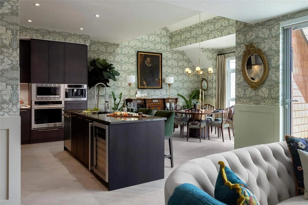 Modern luxury meets old world charm in this stunning 3-bdrm penthouse at Oakwoods by Aragon. Soaring ceilings are highlighted by gorgeous William Morris wallcoverings & elegant wainscoting throughout. A folding glass window wall opens your main living area to an inviting terrace over a European-style courtyard. Chef-inspired kitchen features polished tile backsplash, Italian ash cabinetry incl. floor- to-ceiling pantry, a premier GE Monogram appliance package with 48” fridge,36” 5-burner gas cooktop & under-counter wine reserve. Mornings are made better with your built-in Fulgor Milano espresso maker & a geothermal heat pump offers year-round comfort. A highlight of this exquisite home is the 525 sq ft west-facing upper terrace overlooking historic Rosemead House with ocean & mtn views beyond. Oakwoods residents will enjoy exclusive resort-style living with a well-equipped fitness centre, easy access to Janevca Kitchen & Lounge and the soon-to-open Salt and Ivy Spa. Move in this fall!