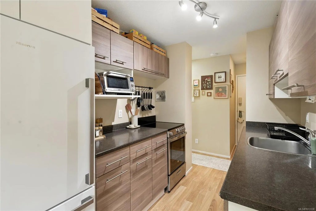 Step into an inviting one-bedroom, one-bath condo in the well-managed Bowen Terraces community. Ideally situated across from Bowen Park and just minutes on foot from Vancouver Island University as well as the Aquatic and Ice Centres, this home also benefits from a bus stop right outside the complex for easy commuting. Inside, you’ll find a thoughtfully updated space with a modernized kitchen, newer flooring, and a refreshed bathroom. The layout includes a generous living area, bright dining nook, convenient storage room, and a spacious bedroom. A private balcony overlooks mature greenery, creating a peaceful outdoor retreat. Heat and hot water are covered in the strata fees, keeping additional utility costs low. The building allows rentals, pets (size & number limit), includes one assigned parking space plus visitor parking, and offers excellent value in a central location. Reach out for your private showing today!