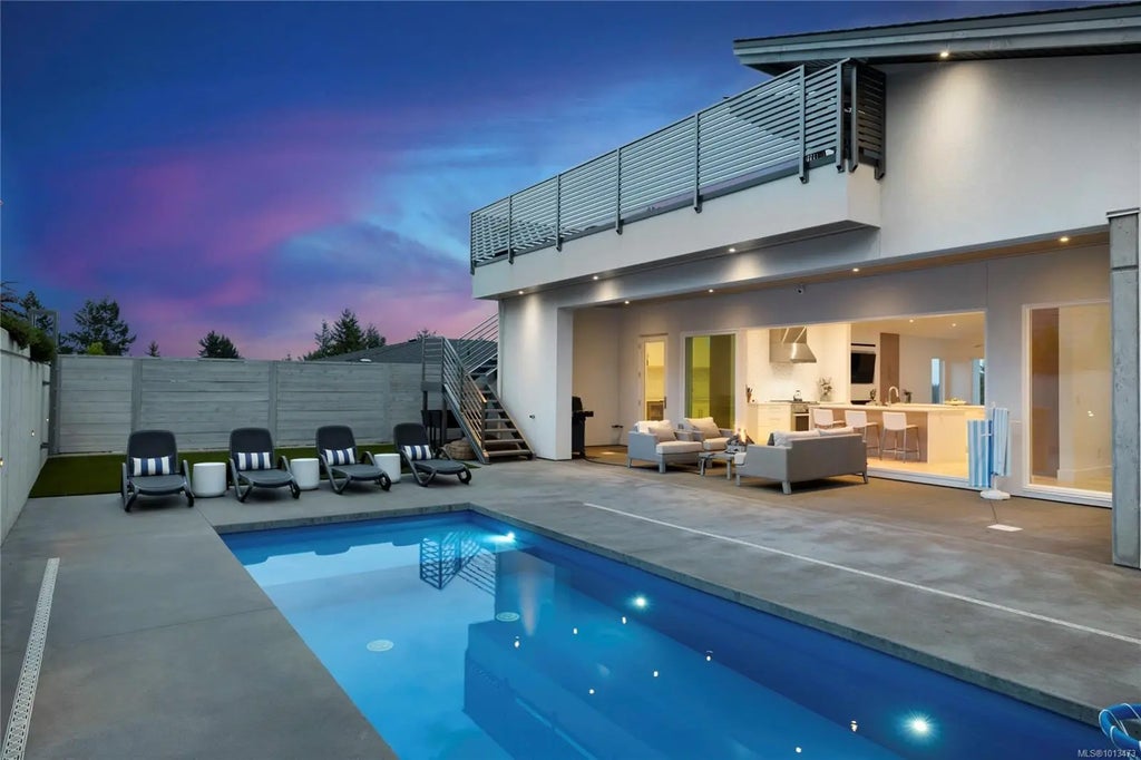 This custom built home enjoys a southern exposure and boasts an array of luxurious features. The expansive living area seamlessly blends with the outdoors through a 20’ sliding door leading to a private fenced yard complete with a covered patio and a 25x10 heated in-ground pool. Exterior aluminum stairs lead to an impressive 800 sqft rooftop deck with stunning ocean views. Inside, the gourmet kitchen is a chef’s dream with double islands, a Miele Appliance package, and a convenient butler’s kitchen. The generous primary bedroom features a stunning 5pc ensuite with dual vanity, water closet, freestanding tub, glass shower, and a spacious walk-in closet. Throughout the home, you'll find quartz countertops, vaulted ceilings, architectural concrete interior walls, a 72” linear fireplace, custom wood open riser stairs, and engineered oak flooring. There are also two sets of laundry facilities for added convenience. All measurements are approximate and should be independently verified.