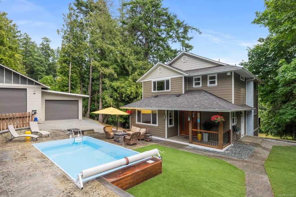 Welcome to 4719 Kevere Road, your private, sunny Metchosin retreat. Set on nearly 2 acres, this exceptional property offers a rare blend of peaceful rural living and modern upgrades. Featuring a 4-bed + office, 4 bath home, 1-bed suite, and dream 20x30 heated shop with 14x27 addition. Modern kitchen with black stainless appliances, new flooring/paint, updated windows, and Hardie Plank siding. Enjoy a 10x20 in-ground pool with stamped concrete patio, ideal for entertaining. The primary suite features an ensuite and custom walk-in closet. Tons of parking for all your toys. Shop includes hoist, roll-up doors, office, compressor, and Tesla charger. Trane heat pump, ductless heat pump in shop, 200AMP in house, plus 100AMP garage and 60AMP pool house. Paved driveway, city water + well for irrigation. This is truly a turn-key property in one of Metchosin’s most sought-after pockets. Quiet cul-de-sac location, functional layout, incredible outdoor living & space to grow! This one has it all.