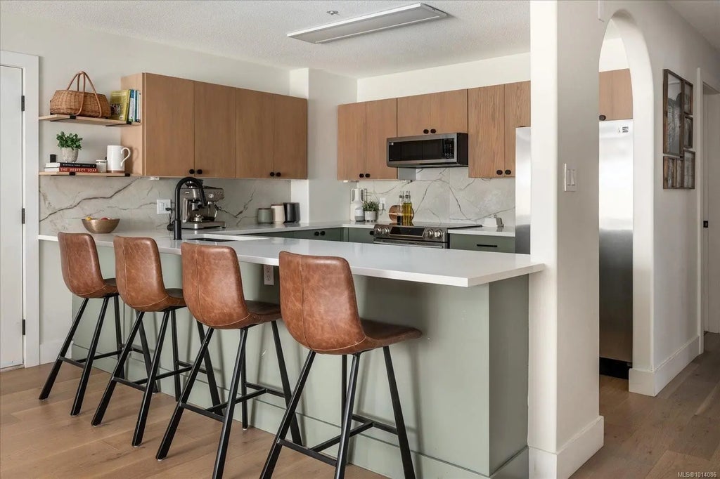This main-level entry townhome with a spacious garage is a rare find! Renovated by the renowned Refined Collective Studio, this townhome is situated in a quiet complex located in the sought-after Divers Lake neighborhood. The home is just a short stroll to Long Lake, Divers Lake and amenities. Inside, the open layout features wide, accessible hallways, 2 generous bedrooms, and 2 updated bathrooms. Stylish touches include a Venetian plaster fireplace, TV slat wall, built-in dining nook, and office space. As a ground-floor corner unit, it also offers a large laundry/storage room and private outdoor retreat. Updates include white oak engineered hardwood, a designer kitchen with white oak + painted cabinetry, quartz counters, stainless appliances, modern lighting, fresh paint, and refreshed bathrooms. Set in a beautifully landscaped, well-maintained complex, this move-in ready home blends style, comfort, and convenience. Don’t miss it! All data approx. & info to be verified.