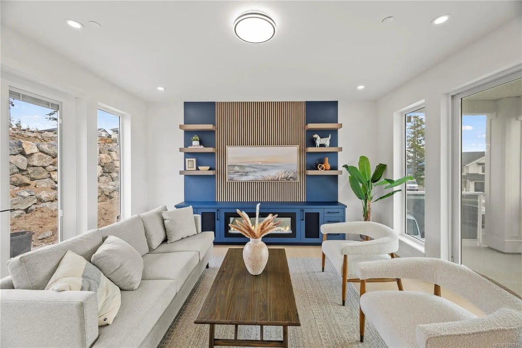 Welcome to 2306 Hudson Terrace, a brand new 5-bedroom, 4-bathroom home at the end of a quiet cul-de-sac providing one of the best value homes in Sooke. This stunning property offers OCEAN VIEWS from all three levels, with two balconies to fully enjoy the scenery. The main floor features an open-concept living/dining area and a modern kitchen with oversized quartz countertops, stainless steel appliances, and access to your landscaped backyard and deck. A stylish family room with fluted walls and floating shelves adds character and style. Upstairs, the primary suite boasts vaulted ceilings, a walk-in closet, and a luxurious 5-piece ensuite. Completing upstairs are two spacious bedrooms, a 4-piece bath and full laundry. A legal suite offers added flexibility, and the home also features a garage, landscaped yard, plenty of parking, roughed-in vacuum, and ducted heating and cooling for year-round comfort. Surrounded by new properties, this home is the epitome of luxury and coastal living.