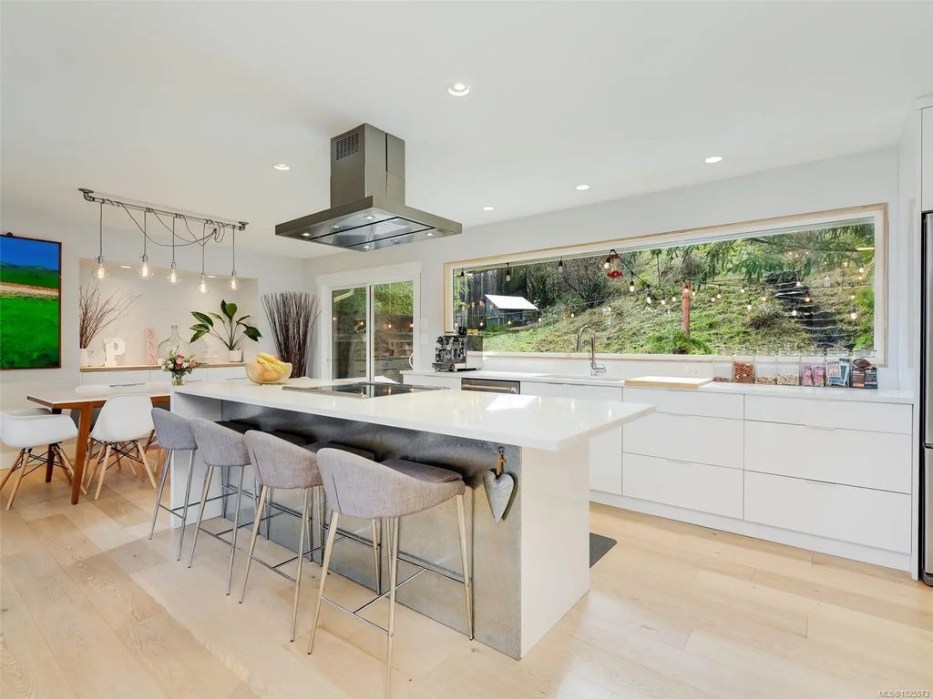 Extensively renovated with designer finishes, this immaculate home is set on a natural forested lot with beautiful mossy rock features. Large windows fill the home with natural light and showcase the peaceful surroundings—truly a must see inside. The open-concept main level is stylish and functional with a statement island and bar seating, ideal for entertaining. A full-span picture window across the kitchen creates a striking connection to nature, while the living room offers views toward downtown Langford and Bear Mountain. Built-in dining cabinetry adds elegant storage. The main level offers 3 bedrooms and 2 bathrooms with light oak flooring throughout. A legal 1-bedroom suite with its own entrance provides flexibility for extended family or a mortgage helper and is currently not tenanted, allowing immediate options for the new owner. Easy-care lot, double garage with good storage, quiet cul-de-sac location minutes to amenities. Excellent opportunity in a busy spring market.