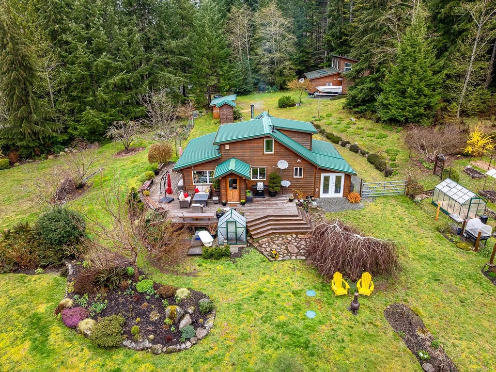 This 10.18 acres of private land includes a 1,633 sq ft 2-bed, 2-bath home, 3-car garage with workshop and suite, and additional cabin. The main home features a wood stove, propane range, and a breakfast bar. A gym/craft/multipurpose room adds additional living space on the ground level. Upstairs is the primary bedroom, office, and a bathroom with a soaker tub and heated tile floors. French doors open to a deck overlooking the yard, which includes perennial gardens and fruit trees. Additional outdoor spaces include a greenhouse, garden/generator shed, and shaded outdoor living room. The 3-car garage is complete with wood stove, skylights, and bathroom. Above the garage, the 1 bed/1 bath suite is perfect for guests or short-term rental. The cabin has its own driveway and full hookups. A generator provides backup water pressure and power to the house, shop, suite, and cabin. This home offers the potential for a variety of uses, from multi-family living to a quiet retreat or hobby farm.