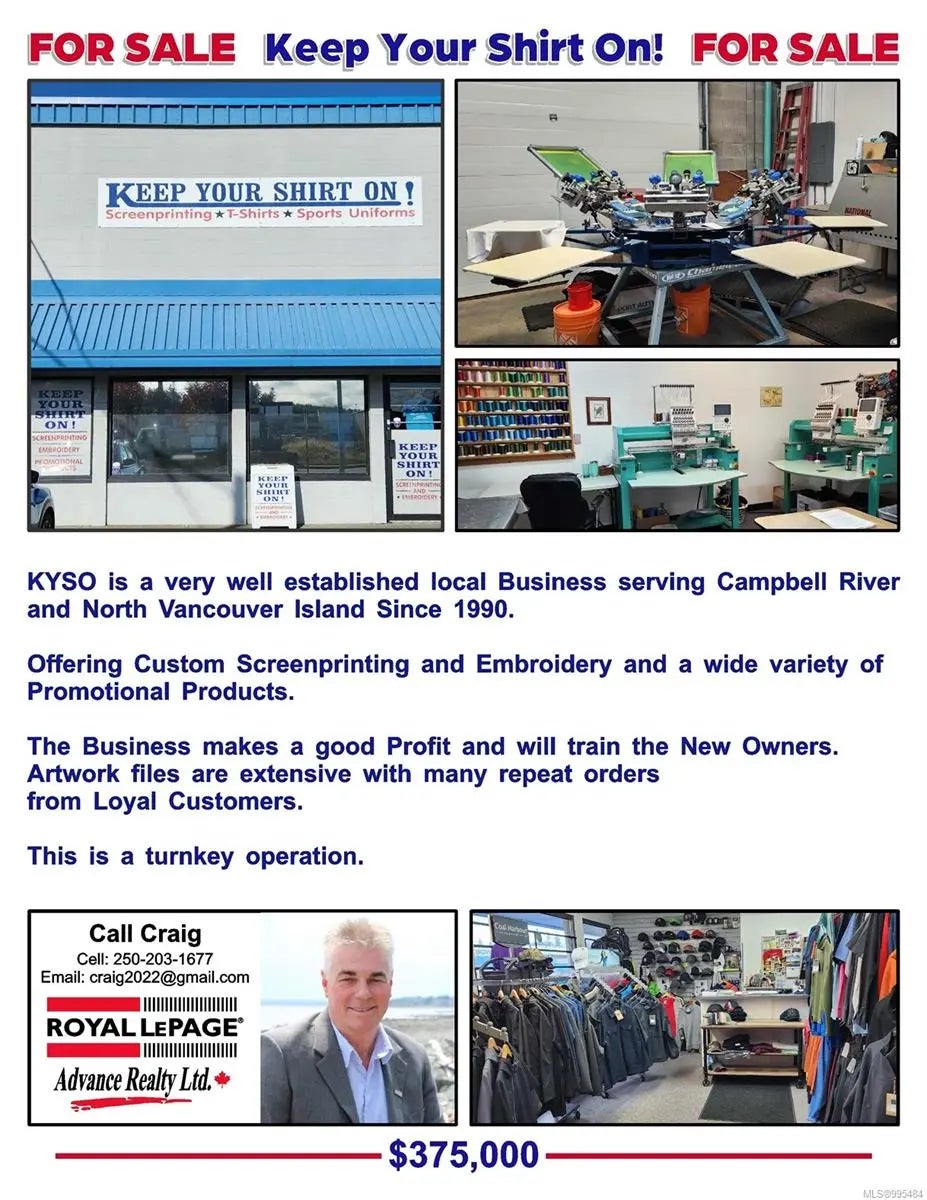 Keep Your Shirt On, a local business that started in 1990 and has served Campbell River and the North Island with custom screen printing, embroidery and promotional paraphernalia. This opportunity makes a good profit and the current owners are willing to train the next generation. This is an asset sale and you will have everything and be ready to go. The list of clients and artwork is extensive and there are many repeat customers and orders.