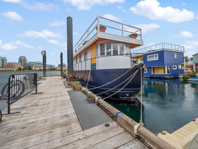 Welcome to the Aloha Sun! Waterfront living in a prime location of Victoria. One of the most desirable moorage locations at Fisherman's Wharf. This float home is built to last with a concrete hull. Open concept floorplan with a full kitchen complete with beautiful wood countertops, a dishwasher, laundry unit, lots of cabinetry space and plenty of windows for your viewing pleasure. Living room has a cozy nook with large picturesque window perfect for reading or napping plus patio doors leading to the covered deck with your stunning view of the inner harbour. The lower level offers a master bedroom, a guest bedroom, a 4-pc bathroom and access to a generous storage space. Porthole windows with attention to detail in the serene and nautical decor throughout. The roof top deck is 530sqft providing opportunity for entertainment or lounging as you relax by the water.